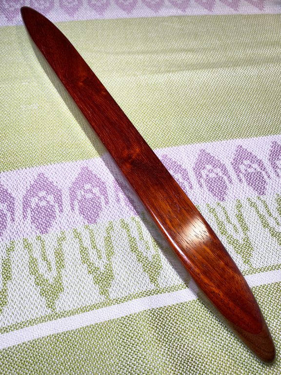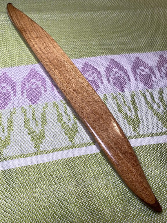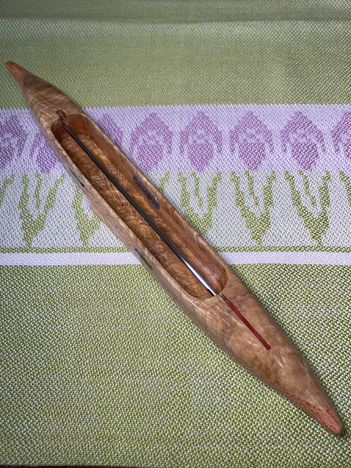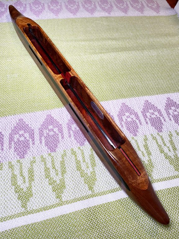 Above: 2025dboat554: Double boat shuttle. Figured koa top, black walnut featherwood center, padauk bottom. Pink ivory inlays on top and ebony yarn slot surrounds on side. 18 1/4″L, 1 7/16″W, 1 3/16″H, 7.0 oz.