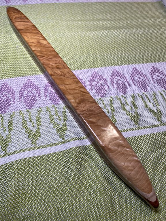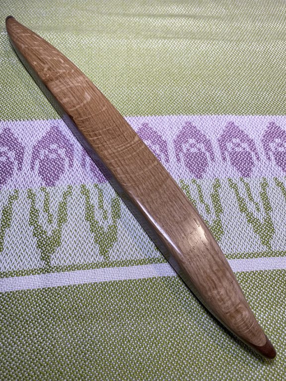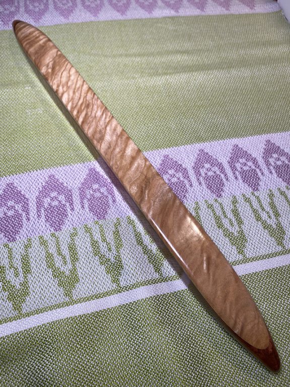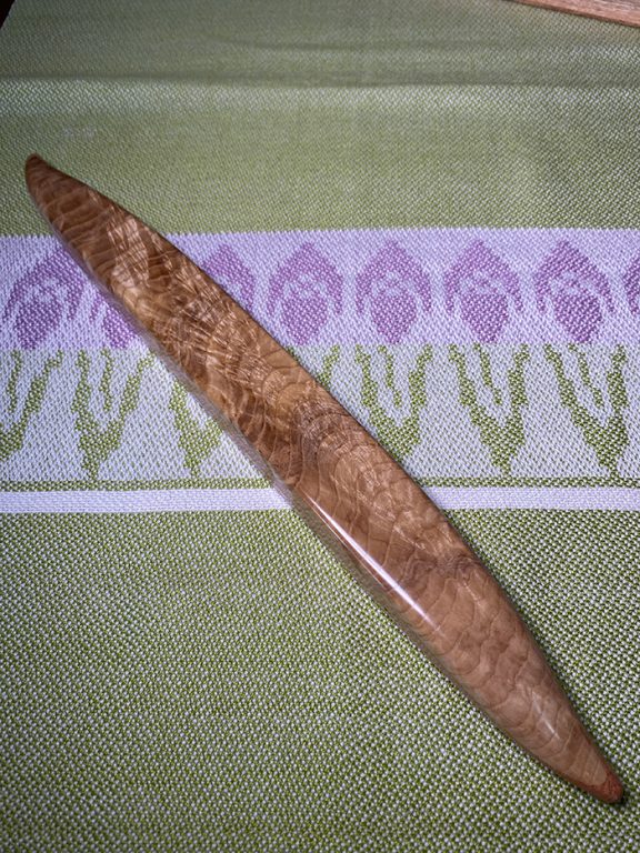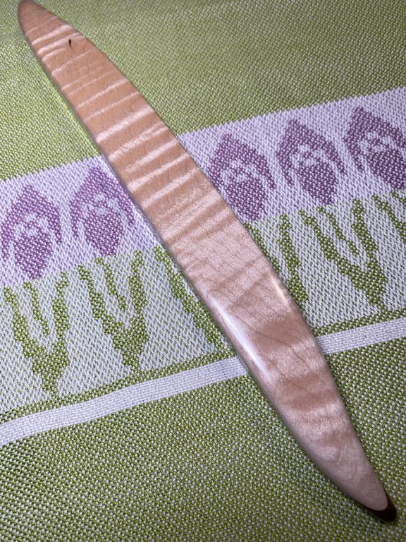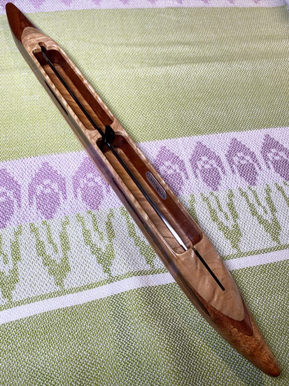 Above: 2025dboat556: Double boat shuttle. Ash Burl top/bottom, tiger maple second layers, koa center. Ebony inlays on top and ebony yarn slot surrounds on side. 18 1/4″L, 1 7/16″W, 1 3/16″H, 6.8 oz.