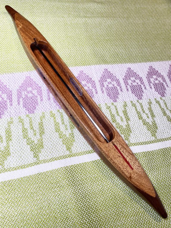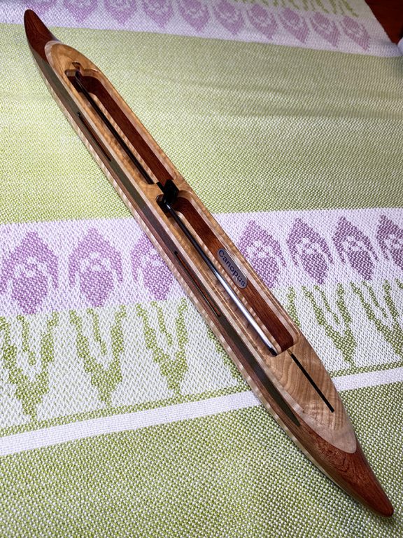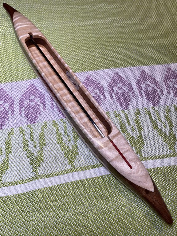 Canopus Boat shuttles are made up of 3 (or sometimes 5) layers of figured hardwoods, typically combinations of bird’s eye maple, tiger maple (big leaf maple and hard maple), curly cherry, curly white oak,  black walnut, figured koa, figured mango, ziricote, ash burl, maple burl, mesquite, and honey locust. Shuttles are highly contoured and fine sanded to 2000-grit with 10 coats of finish applied. A 4mm polished stainless steel rod fits quills or plastic bobbins, and operates up & down using an internal spring mechanism.  The spring slot on top is covered either with ebony (black) or pink ivory (red).  In the shuttle descriptions below,  wood types used, L,W,H, and weight are listed.  Most shuttles are made with low heights for use with looms with narrow sheds.