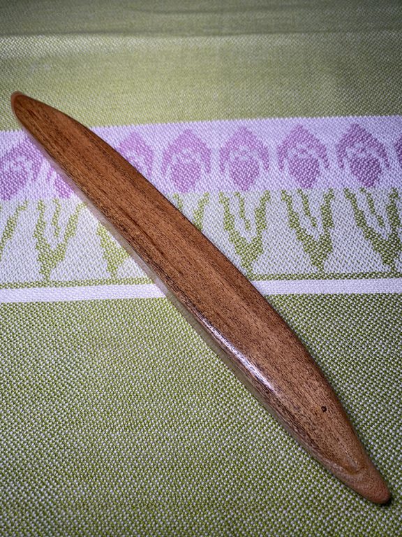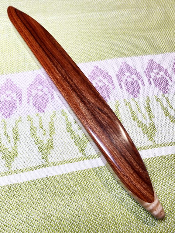Above: 2025dboat555: Double boat shuttle. Ash Burl top/bottom, dark koa band 2nd layers, koa center. Ebony inlays on top and cocobolo yarn slot surrounds on side. 18 3/4″L, 1 7/16″W, 1 1/8″H, 6.5 oz.