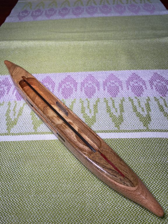 Quill shuttles are typically used in Scandinavian weaving or on looms with narrow sheds. Quills are economical – they may be purchased or made from stiff paper. Quills hold more yarn than a bobbin of comparable size and are quieter to use. Many weavers prefer the use of quills for better selvedges.