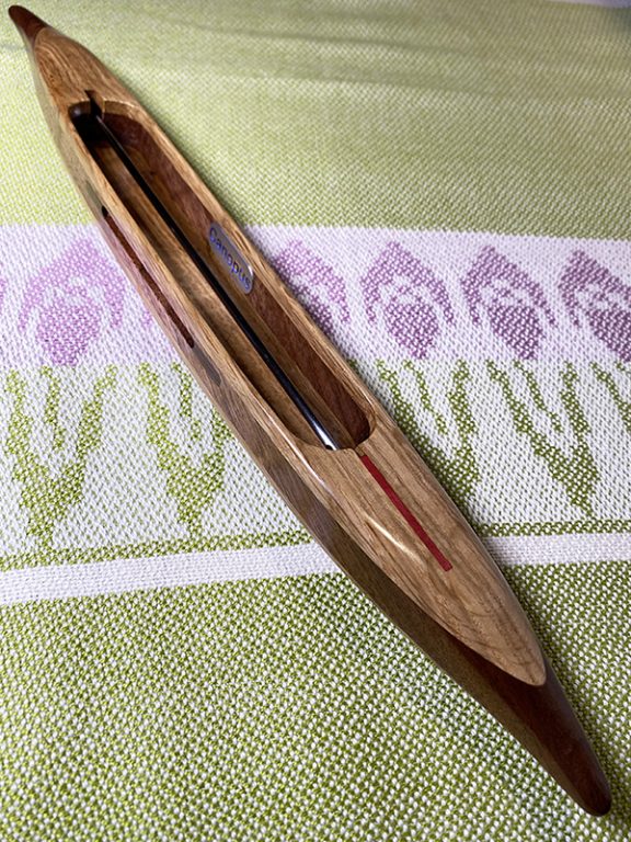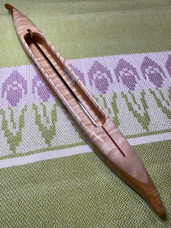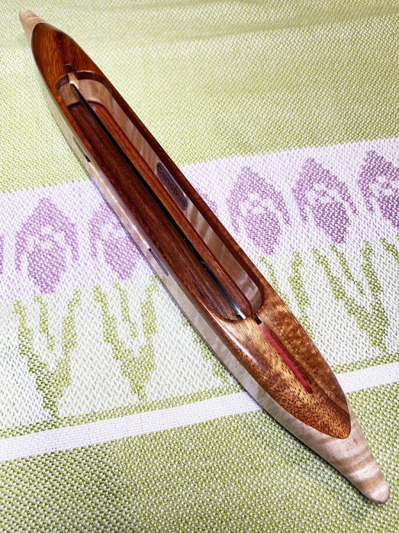 Canopus Quill shuttles are made up of 3 (or rarely 5) layers of figured hardwoods, typically combinations of bird’s eye maple, tiger maple, curly cherry, curly white oak,  black walnut, koa, mango, and honey locust. Shuttles are highly contoured and fine sanded to 2000-grit with 10 coats of finish applied. A 3.5mm polished stainless steel rod fits standard cardboard quills, and operates up & down using an internal spring mechanism. Extremely hard Brazilian ebony, or sometimes lignum vitae inserts are placed at either end of the yarn slot to reduce wear from abrasive yarns like linen and hemp. The spring slot on top is covered either with ebony (black) or pink ivory (red).  In the shuttle descriptions below, we list the shuttle weight, L,W,H.  Damask shuttles are less than 3/4″ height.
