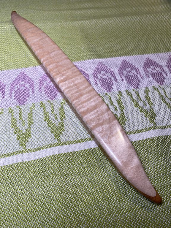 Above: 2025qs553: Tiger maple t/b, Black walnut center. 15″L, 1 1/2″W, 7/8″H, 3.9 oz.